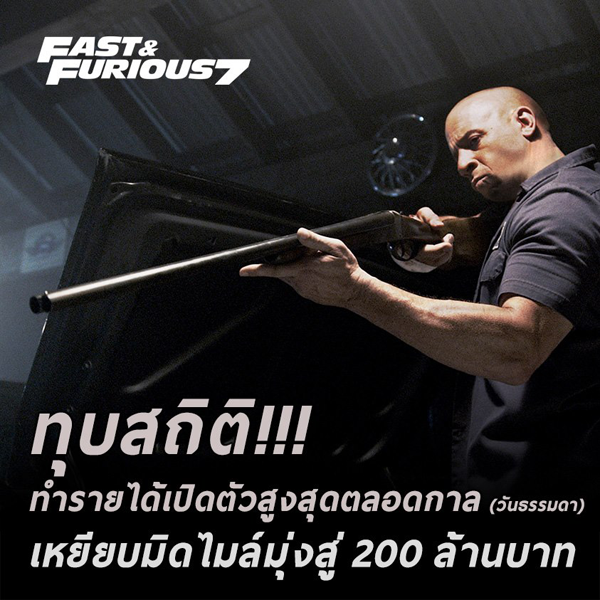 และในวันนี้ที่เข้าฉายเป็นวันที่ 2 ภาพยนตร์เรื่อง Fast & Furious 7 ก็สามารถทุบสถิติรายได้เปิดตัวสูงสุดตลอดกาล (วันธรรมดา) ได้เป็นที่เรียบร้อยแล้ว มุ่งทะยานสู่ 200 ล้านบาท และแว่ว ๆ มาว่ายังมีอีกหลายคนที่ไม่สามารถจองตั๋วเข้าไปชมได้เนื่องจากมีผู้ชมแน่นทุกโรง
