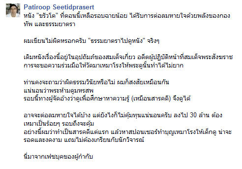 "หนัง "ขรัวโต" ที่ตอนนี้เหลือรอบฉายน้อย ได้รับการต่อลมหายใจด้วยพลังของกองทัพ และธรรมยาตรา