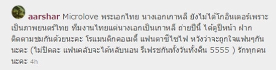 โดยมีข้อความระบุว่า "Microlove พระเอกไทย นางเอกเกาหลี ยังไม่ได้โกอินเตอร์เพราะเป็นภาพยนตร์ไทย ทีมงานไทยแต่นางเอกเป็นเกาหลี ถ่ายปีนี้ ได้ดูปีหน้า ฝากติดตามชมกันด้วยนะคะ โรแมนติกคอมเมดี้ ไซไฟ-แฟนตาซี หวังว่าจะถูกใจแฟน ๆ กันนะคะ (ไม่ปิดละ แฟนคลับจะได้หลับนอน รีเฟรชกันทั้งวันทั้งคืน 5555) รักทุกคนนะคะ"