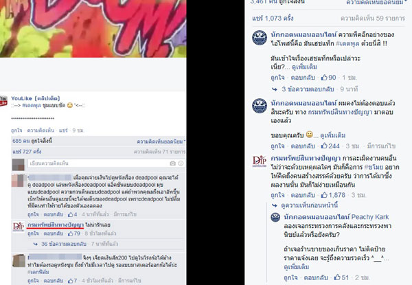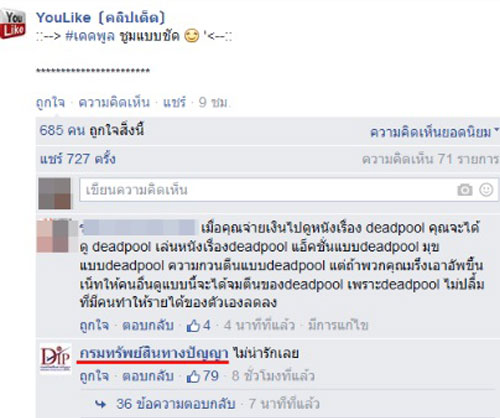 เพจดังแชร์หนังซูม "Deadpool" เจอกรมทรัพย์สินทางปัญญามาเม้นท์ ลบแทบไม่ทัน !! ชี้เป็นการกระทำที่ไม่น่าเอาอย่าง ละเมิดงานคนอื่นถือว่าเป็นขโมย