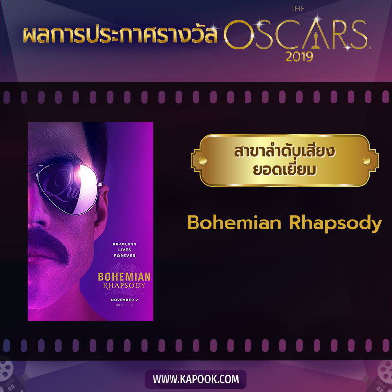 ประกาศผลเป็นที่เรียบร้อยแล้ว สำหรับผลรางวัล Oscars 2019 (ออสการ์ 2019) ครั้งที่ 91 เมื่อเวลา 08.00 น. ของวันที่ 25 กุมภาพันธ์ 2019 ตามเวลาท้องถิ่นในประเทศไทย ซึ่งผลปรากฏว่าหนังกระแสดีอย่าง Bohemian Rhapsody คว้า 4 รางวัลใหญ่ นำแสดงชายยอดเยี่ยม (รามี มาเลค) ตัดต่อเสียงยอดเยี่ยม ลำดับเสียงยอดเยี่ยม ลำดับภาพยอดเยี่ยม ด้านม้ามืดอย่าง Green Book คว้าไป 3 รางวัล ภาพยนตร์ยอดเยี่ยม นักแสดงสมทบชายยอดเยี่ยม และบทภาพยนตร์ดั้งเดิมยอดเยี่ยม ส่วนนำแสดงหญิงยอดเยี่ยมตกเป็นของ โอลิเวีย โคลแมน จาก The Favourite