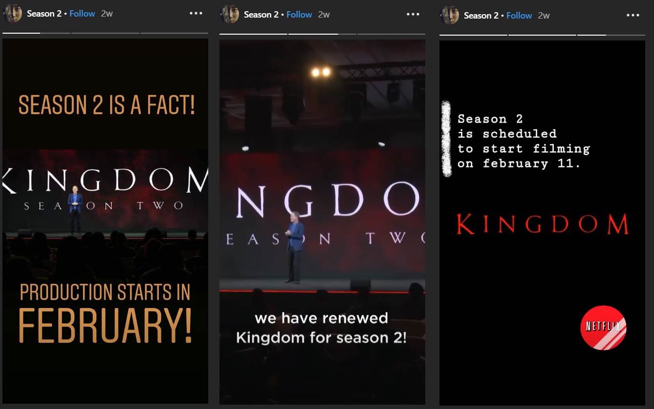 จนถึงตอนนี้ยังไม่มีกำหนดการฉายซีรีส์ Kingdom ซีซั่น 2 ออกมาอย่างเป็นทางการ แต่ว่าการถ่ายทำซีซั่นนี้ได้เริ่มต้นไปแล้วในเดือนกุมภาพันธ์ และคาดการณ์ว่าจะเสร็จเรียบร้อยในเดือนมิถุนายน บวกเวลาตัดต่อเบื้องหลังเพิ่มอีกสักประมาณ 4-6 เดือน เชื่อว่าน่าจะปล่อยออกมาให้ได้รับชมกันในช่วงสิ้นปี 2019 ถึงต้นปี 2020 อย่างไรแฟน ๆ ก็สามารถคาดหวังและตั้งตารอซีรีส์สุดเข้มข้นนี้ได้อย่างเต็มที่ ส่วนใครที่ยังไม่ได้ดูซีซั่นแรกหรืออยากทบทวนก่อนซีซั่นสอง ก็ตามไปรับชม รับฟังทั้งหมด 6 ตอนรวดได้ที่ Netflix เลยค่ะ