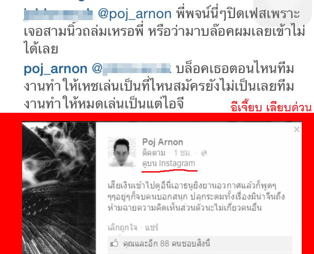 อย่างไรก็ตาม ดูเหมือนว่าโพสต์ดังกล่าวจะมีการตั้งค่าให้แชร์รูปจากอิสตาแกรม มายังเฟซบุ๊ก Poj Arnon ด้วย นำมาซึ่งกระแสวิพากษ์วิจารณ์อย่างท่วมท้น จนกระทั่งได้มีการลบรูปพร้อมข้อความดังกล่าวออกไป ก่อนที่ผู้กำกับคนดังจะปิดเฟซบุ๊กของตัวลงในเวลาต่อมา
