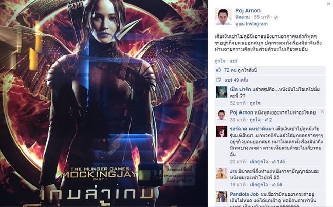 วันนี้ (22 พฤศจิกายน 2557) นับเป็นอีกหนึ่งกระแสจับผิดคนดังที่มีสมาชิกชาวเน็ตเข้ามาติดตามกันมากเลยจริง ๆ สำหรับกรณีที่ผู้กำกับคนดัง พจน์ อานนท์ ออกมาวิพาษ์วิจารณ์ภาพยนตร์เรื่อง The Hunger Games : Mockingjay - Part 1 ผ่านทางอินสตาแกรม poj_arnon หลังจากที่ได้ชมภาพยนตร์ภาพยนตร์เรื่องดังกล่าว โดยมองว่าภาพยนตร์เต็มไปด้วยเนื้อหาปลุกระดมตลอดทั้งเรื่อง จนไม่แปลกใจที่ทางการจีนจะห้ามฉายในประเทศ