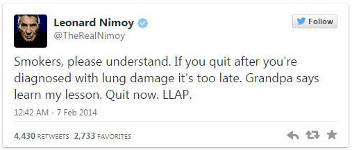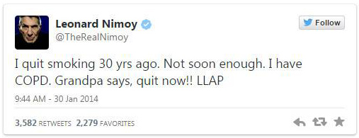 การจากไปของ เลียวนาร์ด นิมอย (Leonard Nimoy) หรือ "สป็อค" แห่ง Star Trek นับเป็นความสูญเสียที่น่าเศร้าอีกครั้งหนึ่งของวงการบันเทิงต่างประเทศ โดยเขาเสียชีวิตในวัย 83 ปี จากโรคปอดอุดกั้นเรื้อรัง หรือ ซีโอพีดี (COPD) ที่สาเหตุส่วนใหญ่มาจากการสูบบุหรี่เป็นระยะเวลานานติดต่อกัน ซึ่งแม้นิมอยจะเลิกสูบบุหรี่ไปนานแล้ว แต่ก็หนีผลร้ายจากมันไม่พ้น