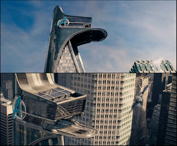 ความน่าสนใจของฉากนี้อยู่ที่ขนาดซึ่งใหญ่ที่สุดเท่าที่สตูดิโอเคยสร้าง และถือเป็นฉากหลังของเหตุการณ์สำคัญในหลายซีน คุณสมบัติทั่วไปของอาคารหลังนี้คือทิวทัศน์ที่มองเห็นเมืองนิวยอร์ก ลานจอดยานควินเจ็ต และพื้นที่ใช้สอยที่เชื่อมต่อถึงกัน ความเป็นมาของตึกบัญชาการ อเวนเจอร์ ถูกสร้างและออกแบบโดย โทนี่ สตาร์ค เป็นสถานที่ไว้สำหรับสมาชิกอเวนเจอร์ได้การวางแผน เรียนรู้ พักผ่อน และทำกิจกรรมร่วมกัน ความสะดวกสบายประกอบไปด้วยห้องรับรอง พื้นที่สำหรับห้องปฏิบัติการ 3 แห่งพร้อมเครื่องอำนวยความสะดวก ห้องออกกำลังกาย บริเวณพักผ่อน และห้องล็อกเกอร์ ซึ่งตึกนี้ถูกออกแบบเพื่อความสะดวกต่อภารกิจและงานวิจัยของ โทนี่ สตาร์ค โดยเฉพาะ