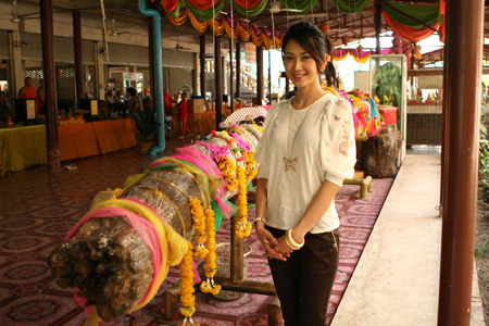 ไปทำบุญครั้งนี้ยุ้ยเล่าว่า "ส่วนตัวแล้ว ยุ้ยเป็นคนชอบทำบุญ ถ้าว่างก็จะทำบุญทุกอาทิตย์อยู่แล้ว พอดียุ้ยรับเล่นหนัง นางตะเคียน ซึ่งยุ้ยก็บอกตรง ๆ เป็นคนกลัวเรื่องนี้มาก ๆ แต่รับเล่นเพราะบทน่าสนใจและมีอะไรหลายอย่างที่คนไม่ค่อยรู้ แล้วก็ได้ยินเรื่องราวอาถรรพ์เกี่ยวกับต้นตะเคียนมานาน มีเรื่องเล่าตั้งแต่บรรพบุรุษจนปัจจุบันก็มี ยุ้ยก็ยิ่งกลัวเข้าไปใหญ่ แล้วยิ่งถ่ายกับต้นตะเคียนจริงด้วย ก็ขนลุกทุกครั้งที่เข้าฉาก ยุ้ยไหว้ท่านทุกครั้งเลยค่ะ ที่ไหนมีต้นตะเคียนถ้ายุ้ยมีเวลายุ้ยก็อยากไปทำบุญ สำหรับที่วัดนี้ก็ท่านเจ้าอาวาส พระครูพิจิตรกิจจาทร ท่านก็บอกว่า มีต้นตะเคียนที่ใหญ่มาก ลอยน้ำมา แล้วก็ติดอยู่ที่คลองข้างวัด แล้วมีคนฝันว่า ที่ต้นตะเคียนต้นนี้ แม่ย่าตะเคียนทอง ศินีนาถ อาศัยอยู่ แล้วชาวบ้านก็ไปกราบไหว้บูชากัน บางคนท่านก็ช่วยเหลือ ซึ่งของแบบนี้ไม่สามารถพิสูจน์ได้ แต่ยุ้ยเชื่อว่ามีจริงค่ะ