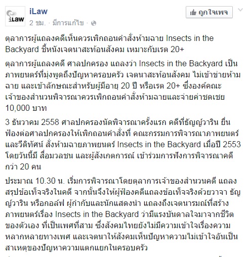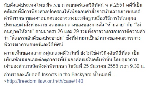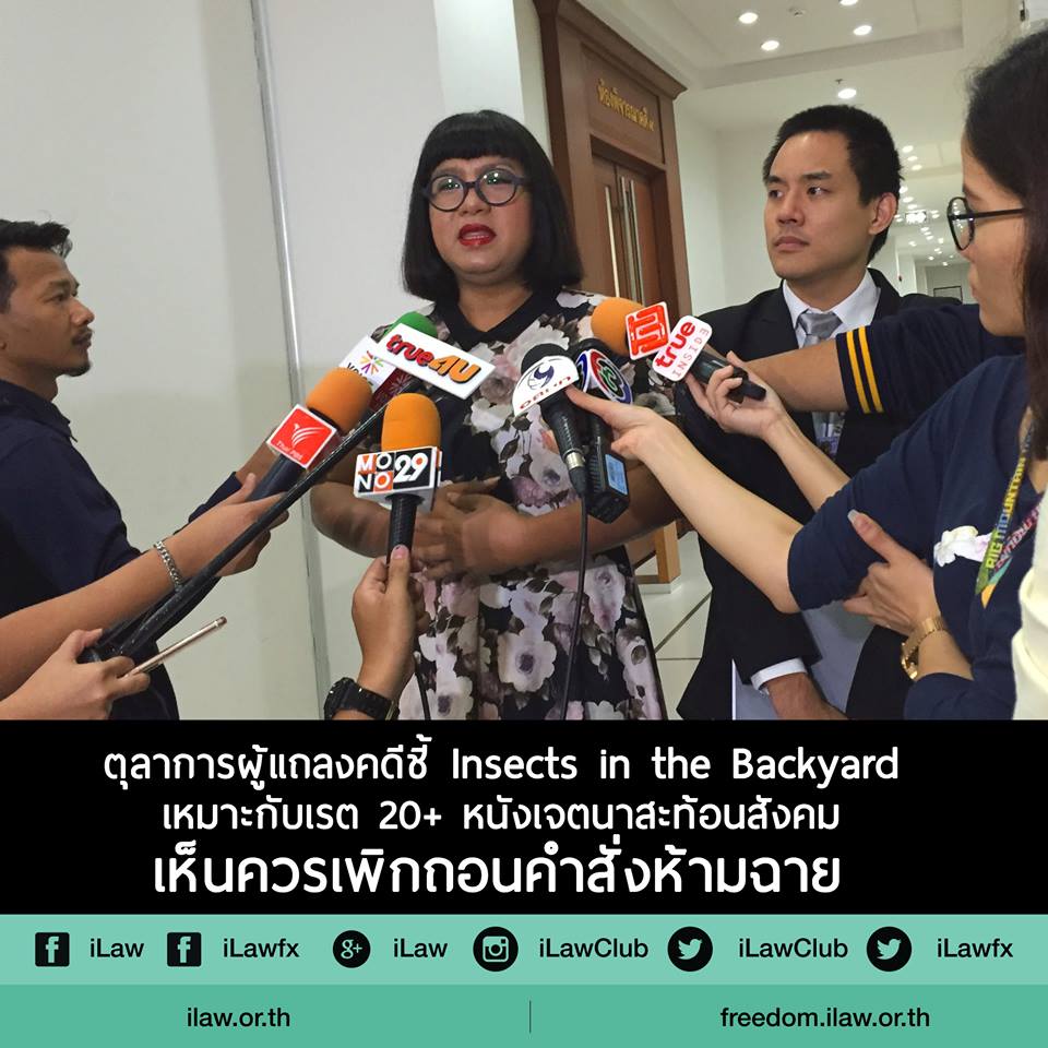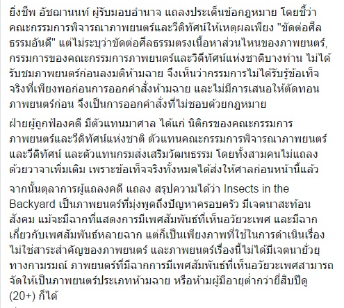 ศาลปกครองได้นัดพิจารณาคดีครั้งแรก ตุลาการเห็นควรเพิกถอนคำสั่งห้ามฉาย ภาพยนตร์เรื่อง Insects in the Backyard หลังถูกแบนปี 2553 นัดฟังคำพิพากษาวันที่ 25 ธันวาคมนี้