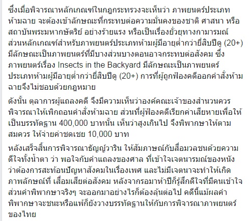 หลังจากคณะกรรมการพิจารณาภาพยนตร์และวีดิทัศน์ มีมติไม่อนุญาตให้ฉายภาพยนตร์แนวดราม่าเรื่อง Insects in the backyard (อินเซค อินเดอะ แบ็คยาร์ด) จากฝีมือการเขียนบทและกำกับของ ธัญญ์วาริน สุขะพิสิษฐ์ เนื่องจากมีเนื้อหาขัดต่อศีลธรรมอันดีของประชาชน เมื่อเดือนธันวาคม 2553 ตามที่ได้มีรายงานไปแล้วนั้น [อ่านข่าว แบน! Insects in the backyard ผิดศีลธรรม-อนาจาร]