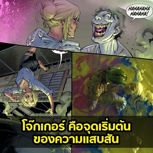3. ในหนังสือการ์ตูนฉบับ The New 52 เธอถูกหวานใจอย่าง โจ๊กเกอร์ ผลักลงไปในถังสารเคมีของบริษัท ACE Chemicals ที่เคยทำให้เขามีผมสีเขียว มีผิวขาวซีด และปากแดง นั่นคือจุดที่ทำให้ ฮาร์ลีย์ ควินน์ กลายเป็นวายร้ายตัวแสบแบบที่เรารู้จัก