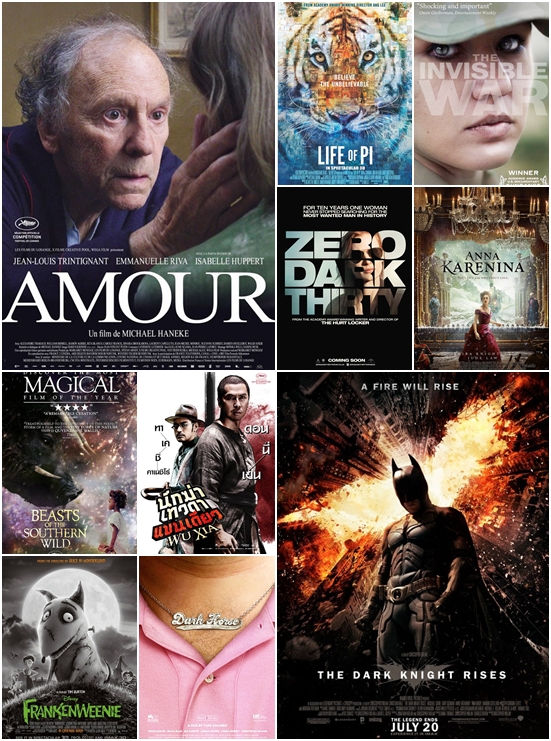 ในช่วงปี 2012 มีภาพยนตร์มากมาย หลายเรื่อง หลากรส เข้ามาให้คอหนังได้เลือกชมกัน และในช่วงเวลาส่งท้ายปีเก่าต้อนรับปีใหม่แบบนี้ นิตยสาร TIME จึงได้จัด 10 อันดับหนังดีที่สุดแห่งปี 2012 จะมีหนังเด่นเรื่องดังเรื่องไหนติดโผที่สุดแห่งปีบ้างนั้น ตามมาดูกันเลย...
